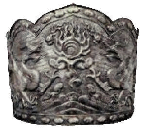 kroon van duizend jaar geleden die een berg laat zien die vuur spuugt maar is